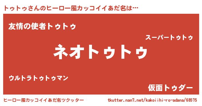 | 男性向けラノベタイトル風あだ名 | 『トゥトゥ~年齢イコール彼女いない歴の魔法使い~』 |
