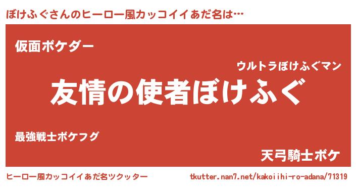 | 男性向けラノベタイトル風あだ名 | 『おまえをオタクにしてやるから、俺をぼけふぐにしてくれ! 』 |