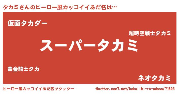 | 男性向けラノベタイトル風あだ名 | 『タカミの憂鬱』『魔弾の王とタカミ』 |