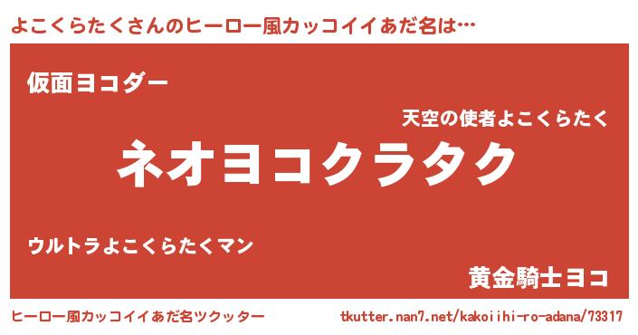 | 男性向けラノベタイトル風あだ名 | 『よこくらたくという概念が存在しない退屈な世界 』 |