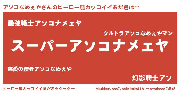 | 男性向けラノベタイトル風あだ名 | 『アソコなめぇやの憂鬱』 |
