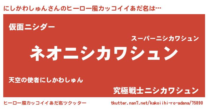 | 男性向けラノベタイトル風あだ名 | 『にしかわしゅん~年齢イコール彼女いない歴の魔法使い~』 |
