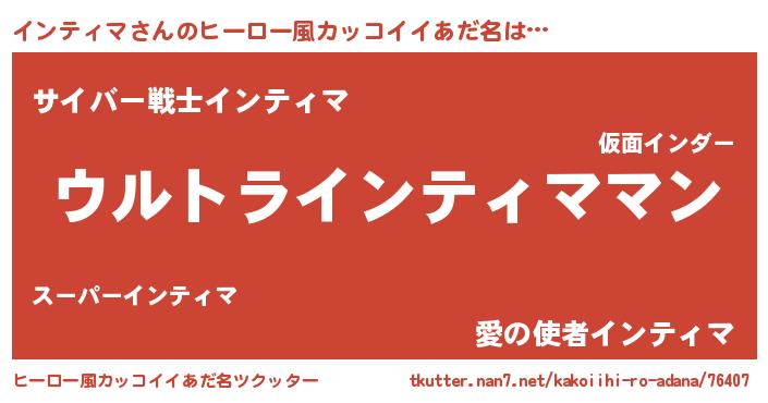 | 女子向けラノベタイトル風あだ名 | 『インティマの玉の輿計画!』 |