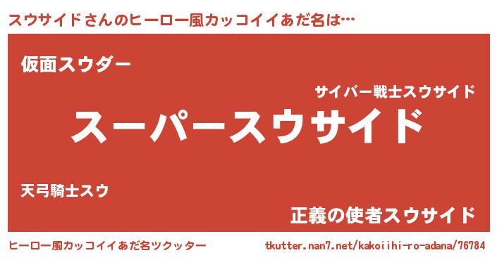 | 男性向けラノベタイトル風あだ名 | 『スウサイド~年齢イコール彼女いない歴の魔法使い~』 |