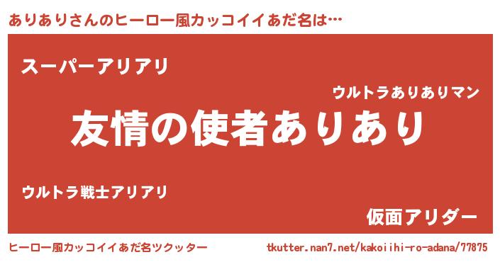 | 男性向けラノベタイトル風あだ名 | 『おまえをオタクにしてやるから、俺をありありにしてくれ! 』 |