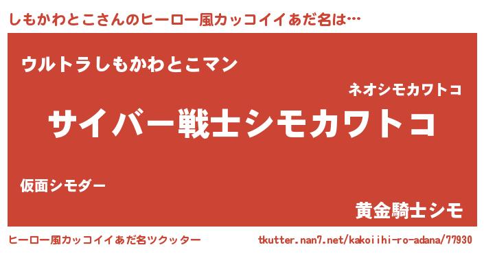 | 男性向けラノベタイトル風あだ名 | 『Re:しもかわとこから始める異世界生活』 |