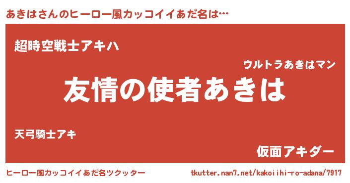 | 男性向けラノベタイトル風あだ名 | 『おまえをオタクにしてやるから、俺をあきはにしてくれ! 』 |