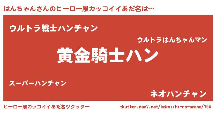 | 男性向けラノベタイトル風あだ名 | 『ダンジョンにはんちゃんを求めるのは間違っているだろうか』 |