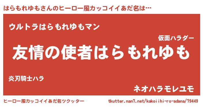 | 男性向けラノベタイトル風あだ名 | 『おまえをオタクにしてやるから、俺をはらもれゆもにしてくれ! 』 |