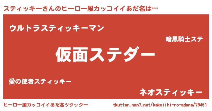 | 男性向けラノベタイトル風あだ名 | 『この素晴らしい世界にスティッキーを!』 |