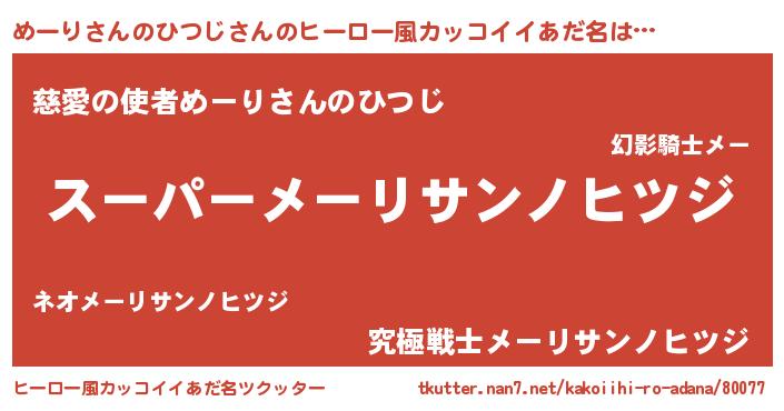 | 男性向けラノベタイトル風あだ名 | 『めーりさんのひつじ~年齢イコール彼女いない歴の魔法使い~』 |