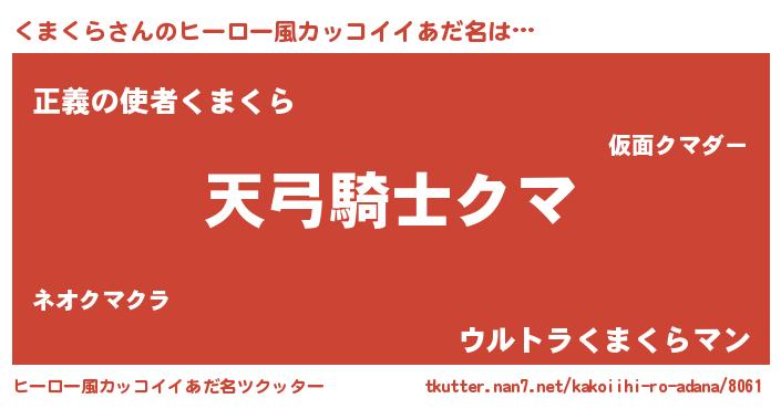 | 男性向けラノベタイトル風あだ名 | 『くまくらの嫁は女の子じゃないと思った?』 |