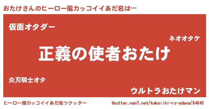 | 男性向けラノベタイトル風あだ名 | 『オタケスレイヤー』『魔弾の王とおたけ』 |