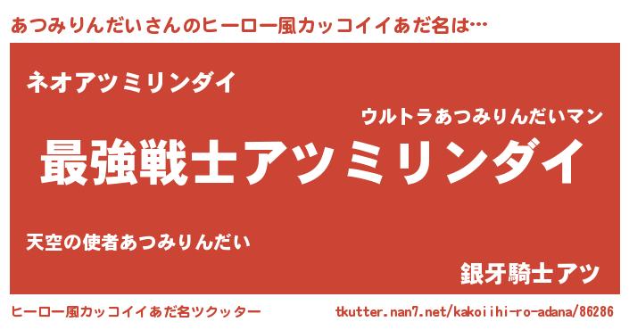 | 男性向けラノベタイトル風あだ名 | 『転生したらあつみりんだいだった件』 |