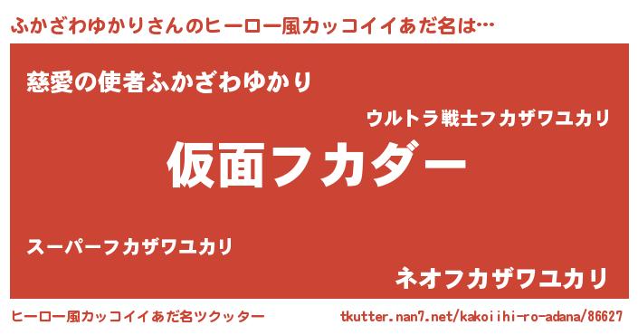 | 男性向けラノベタイトル風あだ名 | 『ふかざわゆかり~年齢イコール彼女いない歴の魔法使い~』 |