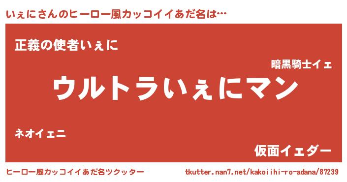 | 男性向けラノベタイトル風あだ名 | 『いぇに~年齢イコール彼女いない歴の魔法使い~』 |