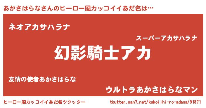 | 男性向けラノベタイトル風あだ名 | 『あかさはらなの嫁は女の子じゃないと思った?』 |