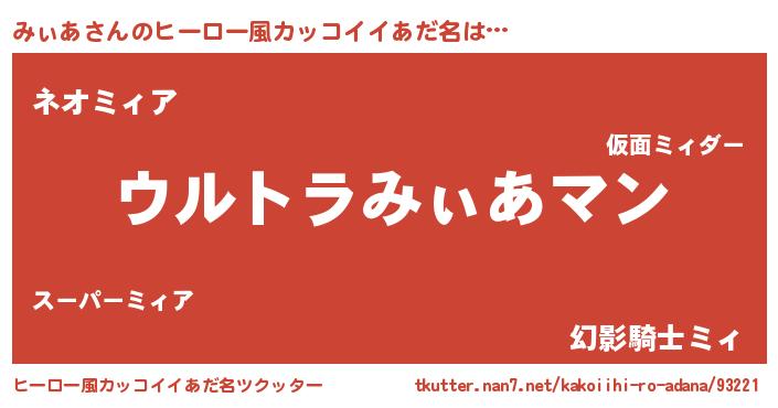 | 男性向けラノベタイトル風あだ名 | 『うちのみぃあが世界を掌握している!』 |