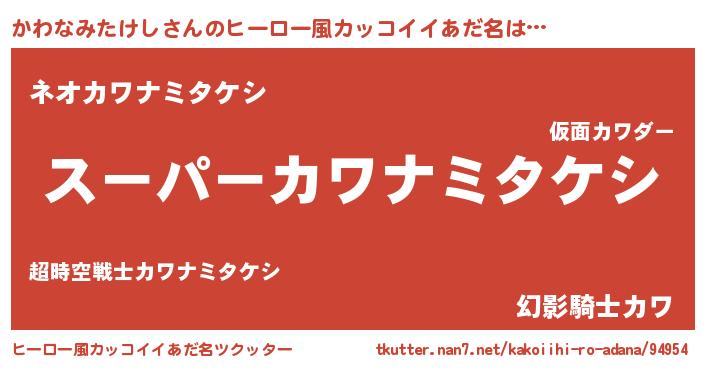 | 男性向けラノベタイトル風あだ名 | 『カワナミタケシアートオンライン』 |