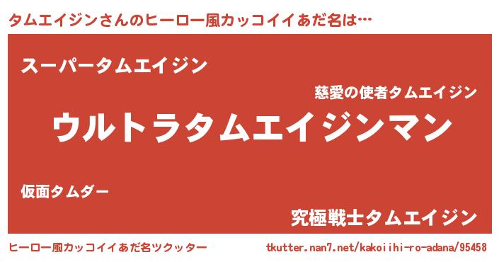 | 男性向けラノベタイトル風あだ名 | 『やはりタムエイジンの青春ラブコメはまちがっている 』 |