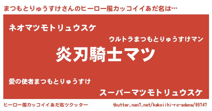 | 男性向けラノベタイトル風あだ名 | 『まつもとりゅうすけ~年齢イコール彼女いない歴の魔法使い~』 |