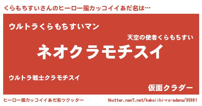 | 男性向けラノベタイトル風あだ名 | 『くらもちすいという概念が存在しない退屈な世界 』 |