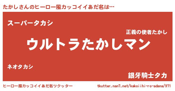 | 男性向けラノベタイトル風あだ名 | 『うちの娘の為ならば、俺はもしかしたらたかしも倒せるかもしれない。』 |