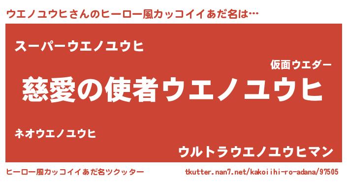 | 男性向けラノベタイトル風あだ名 | 『ウエノユウヒ~年齢イコール彼女いない歴の魔法使い~』 |