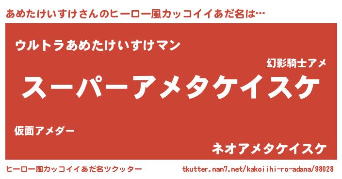 | 女子向けラノベタイトル風あだ名 | 『(仮)あめたけいすけのやんごとなき事情』 |