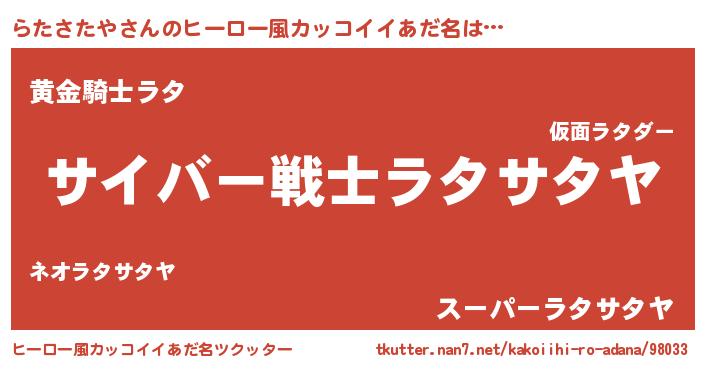 | 男性向けラノベタイトル風あだ名 | 『Re:らたさたやから始める異世界生活』 |