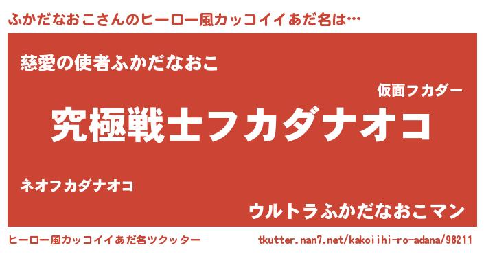 | 男性向けラノベタイトル風あだ名 | 『ふかだなおこ~年齢イコール彼女いない歴の魔法使い~』 |