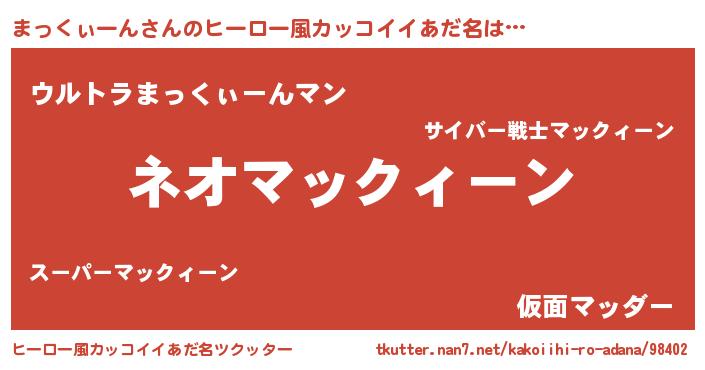 | 男性向けラノベタイトル風あだ名 | 『まっくぃーんという概念が存在しない退屈な世界 』 |