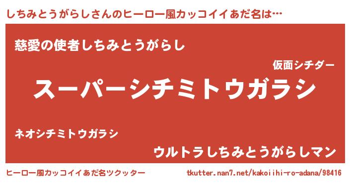 | 胡散臭い通販商品みたいなあだ名 | 『億万長者になれるブレスレット…その名も「しちみとうがらし」』 |