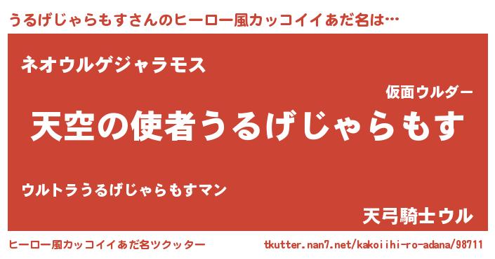| 男性向けラノベタイトル風あだ名 | 『うるげじゃらもす~年齢イコール彼女いない歴の魔法使い~』 |