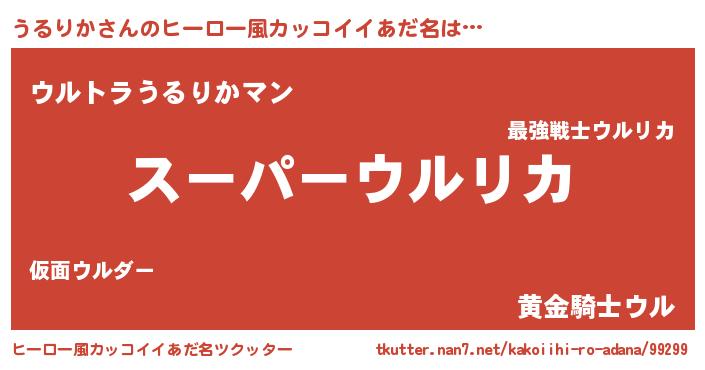 | 男性向けラノベタイトル風あだ名 | 『うるりか~年齢イコール彼女いない歴の魔法使い~』 |