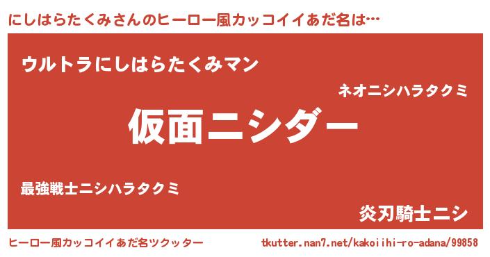 | 意味不明あだ名 | 『住所不定無職にしはらたくみ(40歳)』 |