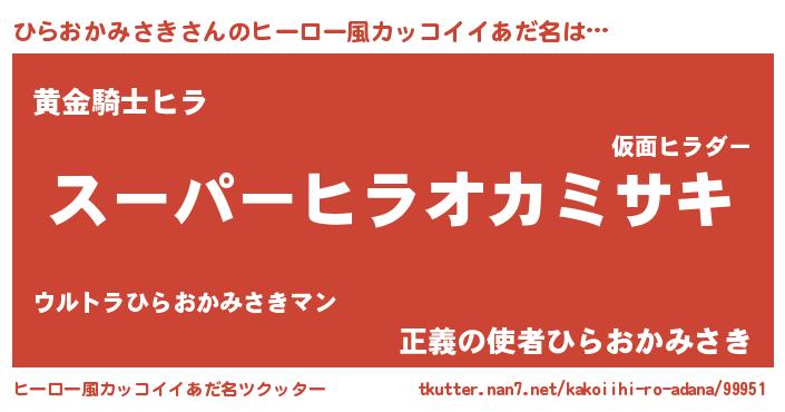 | 男性向けラノベタイトル風あだ名 | 『ひらおかみさき~年齢イコール彼女いない歴の魔法使い~』 |