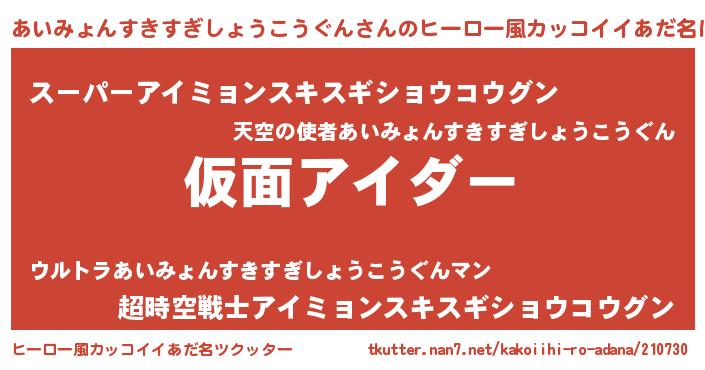 | 男性向けラノベタイトル風あだ名 | 『この素晴らしい世界にあいみょんすきすぎしょうこうぐんを!』 |