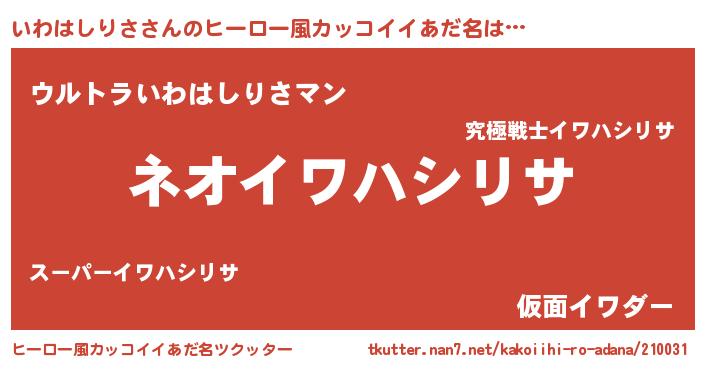 | 男性向けラノベタイトル風あだ名 | 『いわはしりさという概念が存在しない退屈な世界 』 |