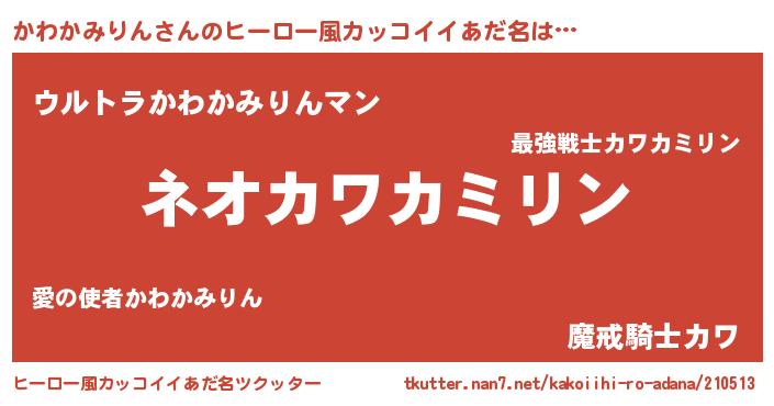 | 女子向けラノベタイトル風あだ名 | 『異世界で失敗しない100のかわかみりん』 |