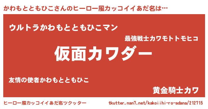 | 男性向けラノベタイトル風あだ名 | 『この素晴らしい世界にかわもとともひこを!』 |