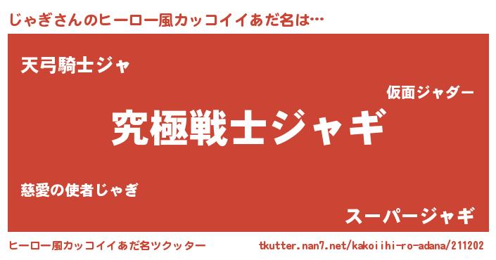 | 男性向けラノベタイトル風あだ名 | 『Re:じゃぎから始める異世界生活』 |