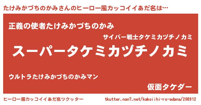 | 男性向けラノベタイトル風あだ名 | 『はたらくたけみかづちのかみさま!』 |