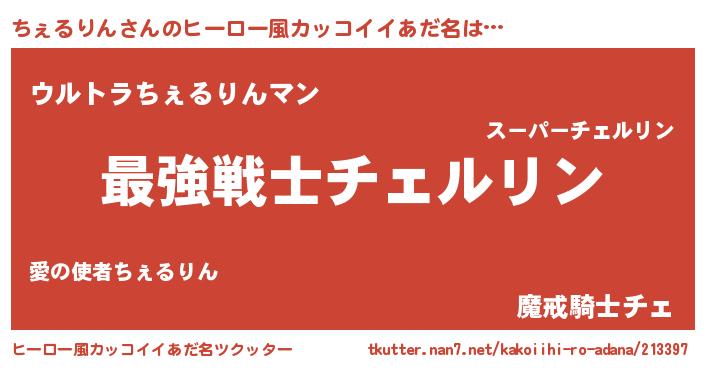 | 男性向けラノベタイトル風あだ名 | 『Re:ちぇるりんから始める異世界生活』 |