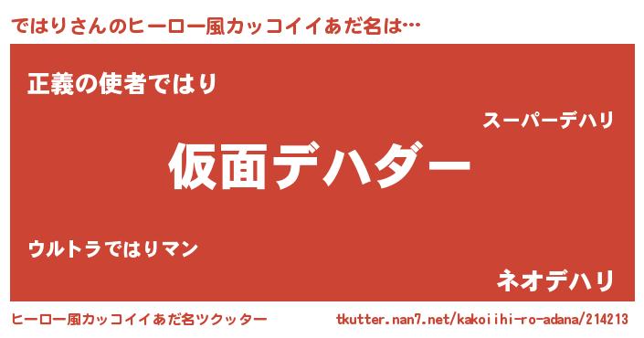 | 男性向けラノベタイトル風あだ名 | 『デハリスレイヤー』『魔弾の王とではり』 |