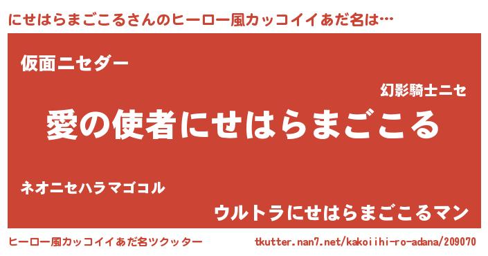| 男性向けラノベタイトル風あだ名 | 『おまえをオタクにしてやるから、俺をにせはらまごこるにしてくれ! 』 |