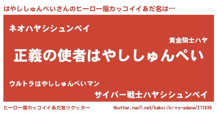 | 男性向けラノベタイトル風あだ名 | 『おまえをオタクにしてやるから、俺をはやししゅんぺいにしてくれ! 』 |