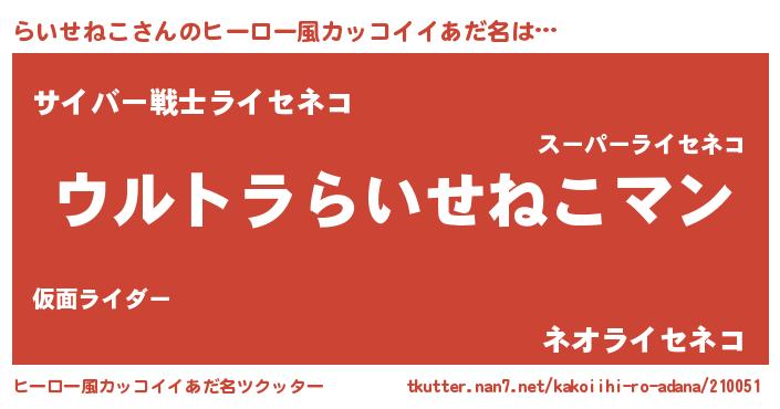 | 男性向けラノベタイトル風あだ名 | 『らいせねこに滅ぼされるだけの簡単なお仕事です』 |