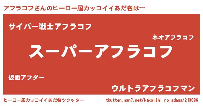 | 男性向けラノベタイトル風あだ名 | 『アフラコフ~年齢イコール彼女いない歴の魔法使い~』 |