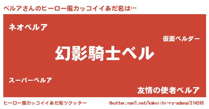 | 男性向けラノベタイトル風あだ名 | 『ベルアの嫁は女の子じゃないと思った?』 |
